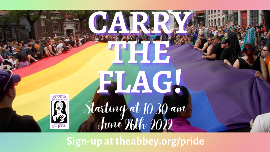 The Sisters of Perpetual Indulgence – The Abbey of St. Joan get the honor of carrying the Pride Flag once again at this year’s Pride Parade! And we want you to join us! The flag is really big and we need all the folks we can get to help us. All genders, ages, creeds, races, orientations and abilities are welcome! Bring the whole family!